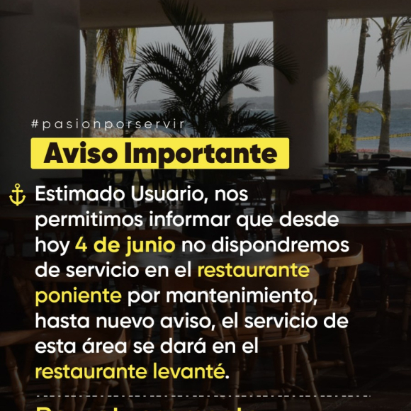 Durante este periodo, la atención y el servicio de esta área se brindarán en el Restaurante Levante.