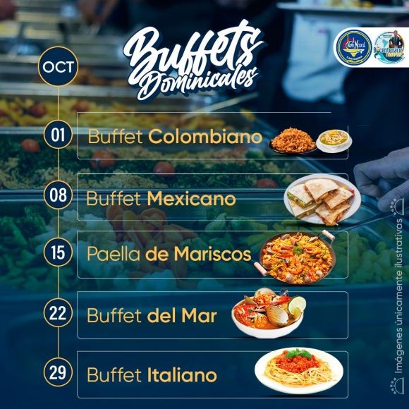 Descubre un mundo de sabores en tu Club Favorito con nuestro calendario de buffets de Octubre.  Deléitate con lo mejor de la gastronomía que tenemos para ofrecer, cada semana una experiencia única.