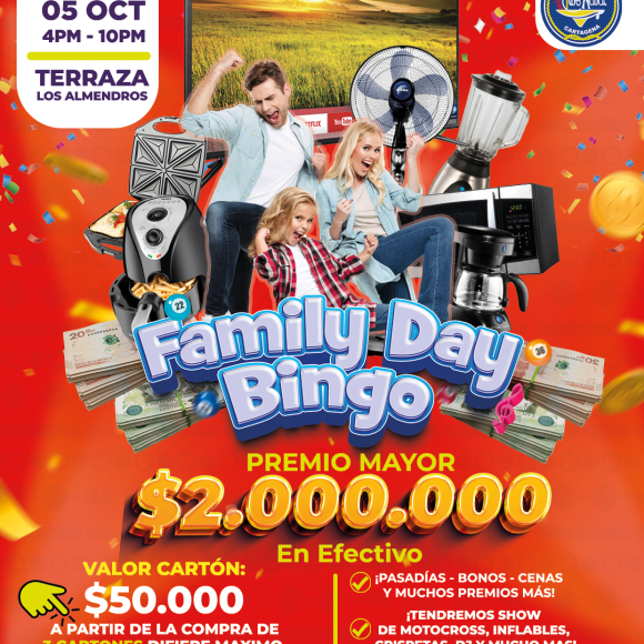 Prepárate para una tarde llena de diversión en el Club Naval!El próximo 5 de octubre, desde las 4:00 PM, ven y disfruta de nuestro Bingo Bailable en la Terraza Los Almendros. Increíbles premios te esperan, y para que la fiesta no pare, tendremos DJ en vivo poniendo la mejor música.!Los niños también tendrán su espacio! Habrá actividades especiales para ellos.No te pierdas esta tarde única llena de entretenimiento para toda la familia. ¡Nos vemos ahí! Increíbles premios te esperan, y para que la fiesta no pare, tendremos DJ en vivo poniendo la mejor música. ¡Los niños también tendrán su espacio! Habrá actividades especiales para ellos.No te pierdas esta tarde única llena de entretenimiento para toda la familia. ¡Nos vemos ahí!
