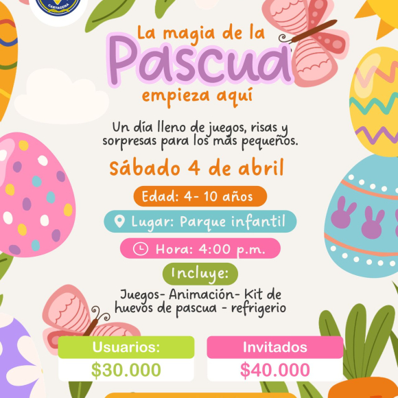 La magia de la Pascua empieza aquí Un día lleno de juegos, risas y sorpresas para los más pequeños.